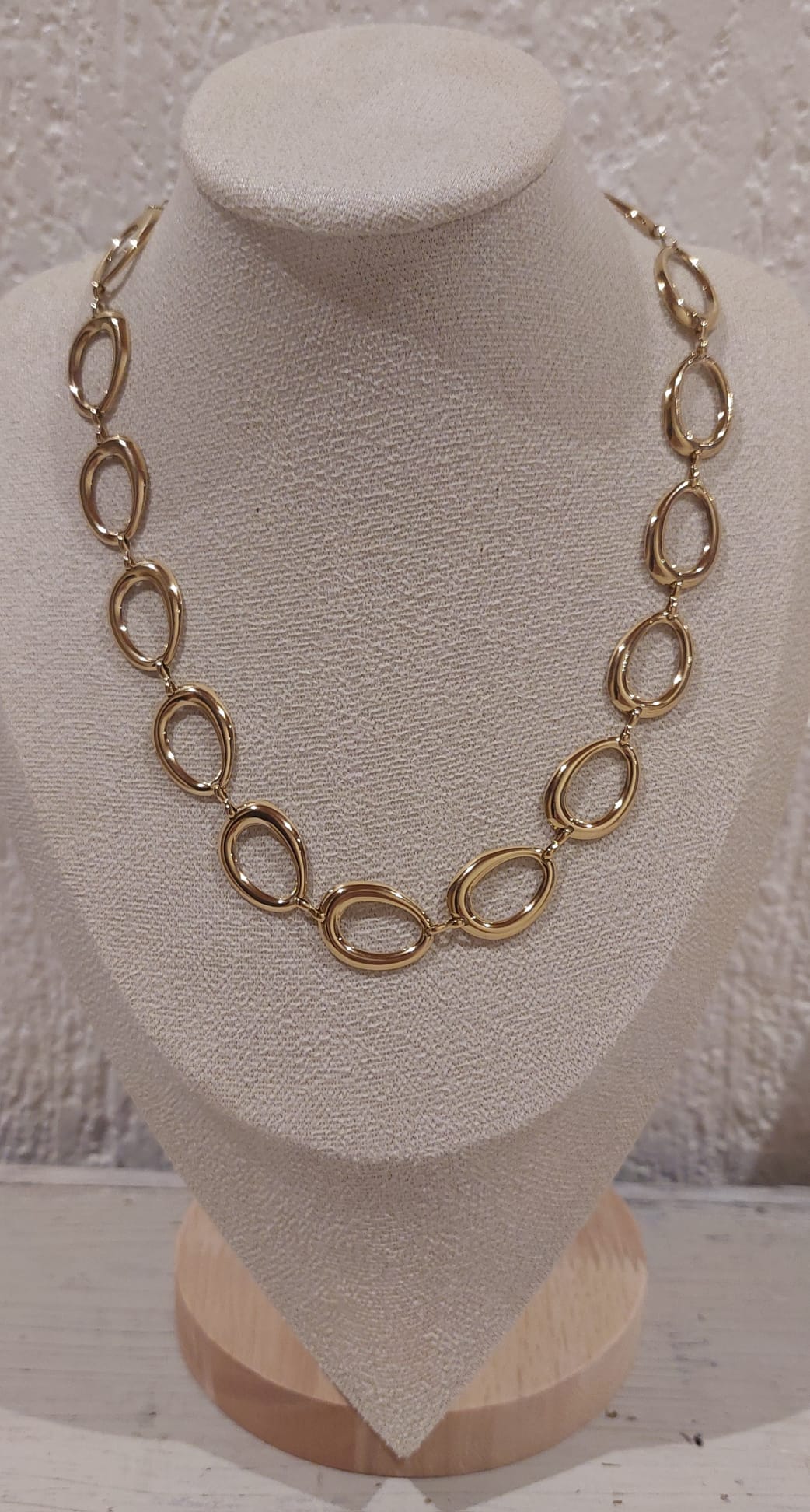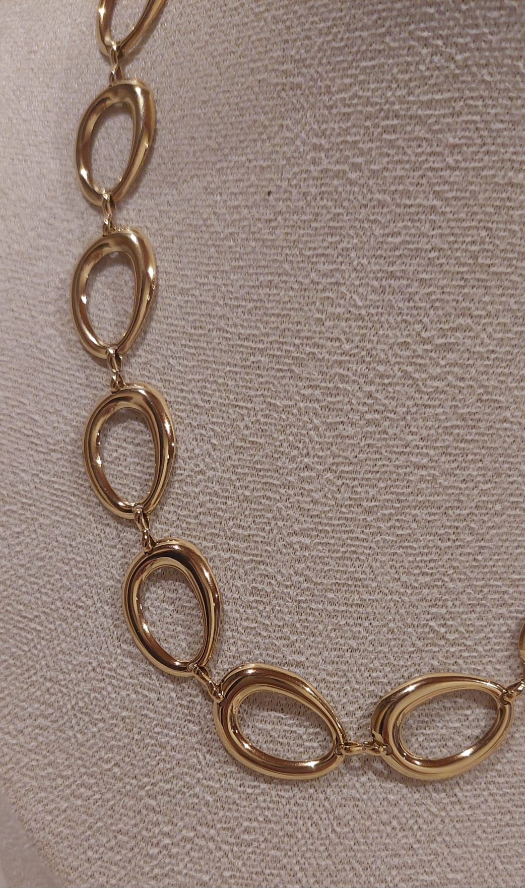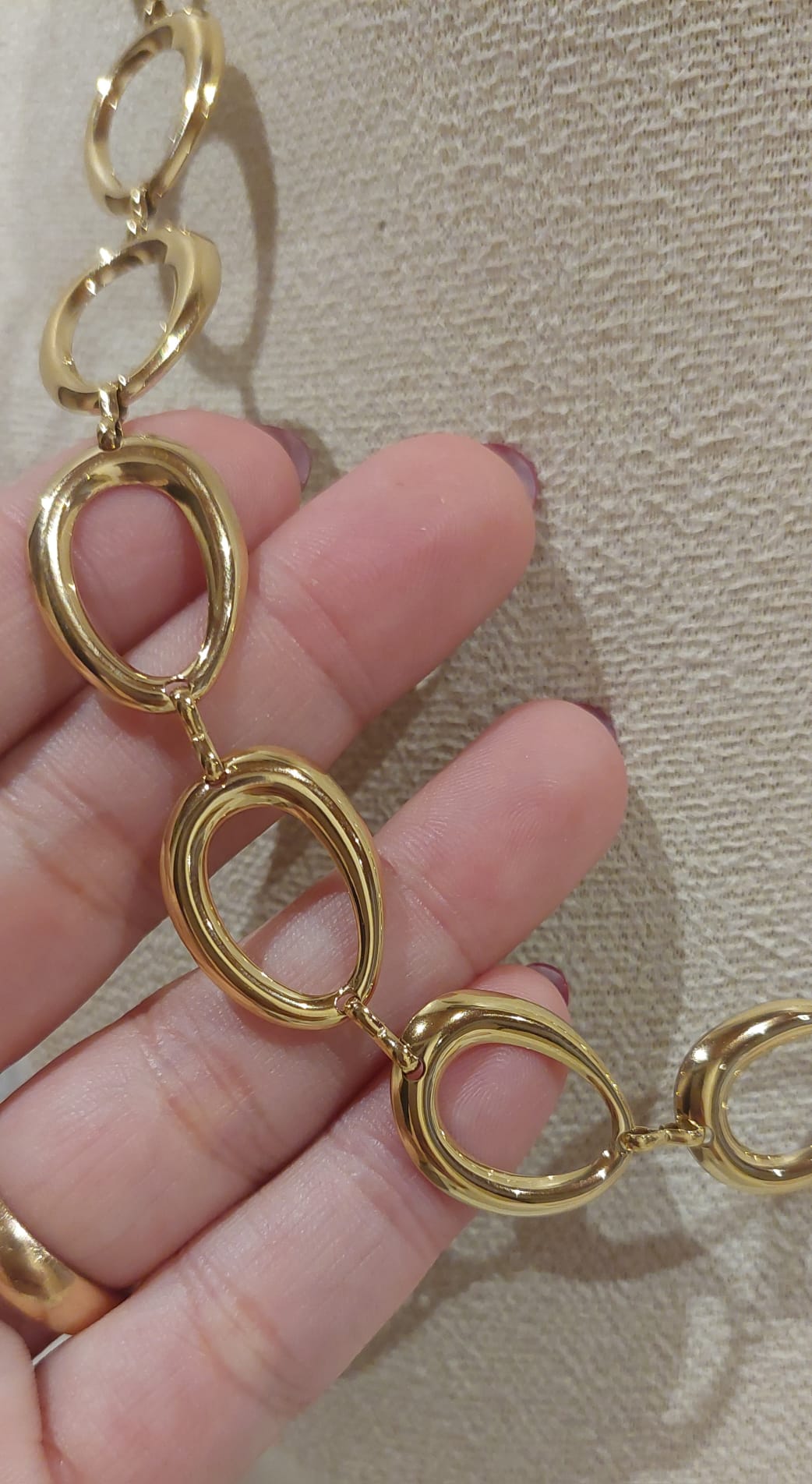 É um colar curto, super leve, a sua malha em argolas ovais largas, o que o distingue pela sua autenticidade.