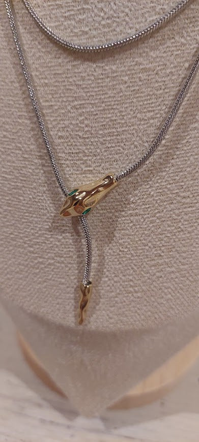 Em aço prateado com a cabeça da cobra em aço dourado, a sobressair o olho verde da cobra, a cabeça é o fecho do colar.