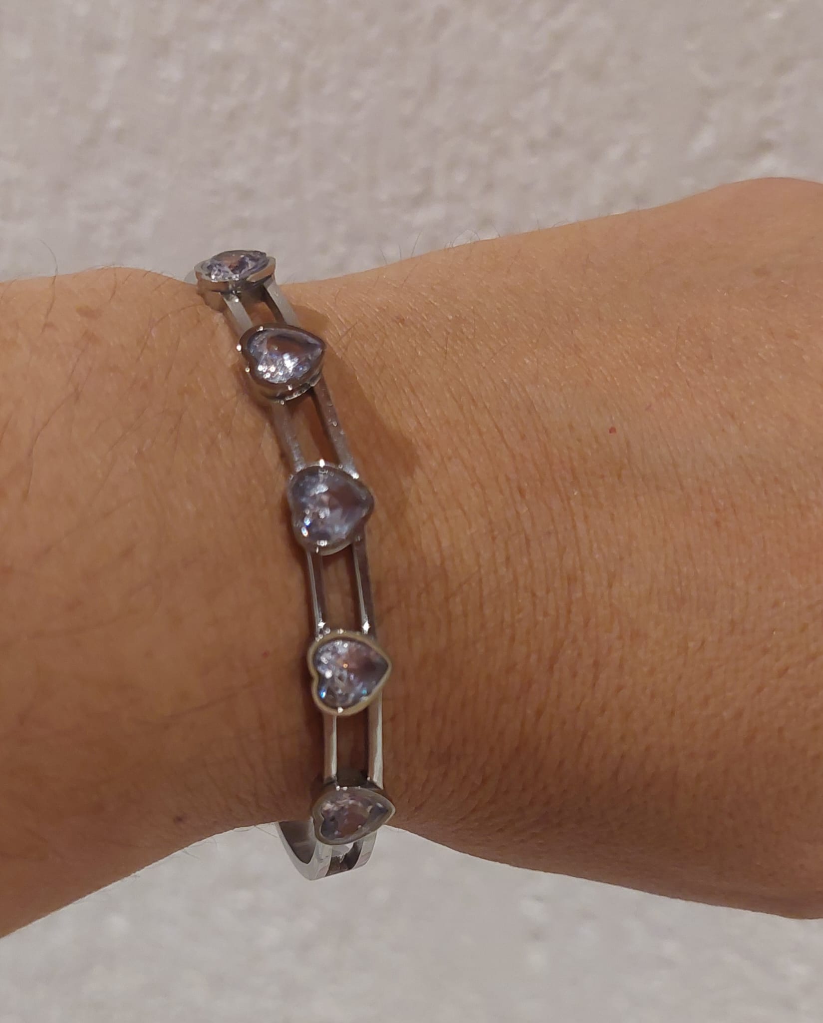 Aço prateado com a mistura dos brilhantes transparentes dos corações. Ajustável no pulso na parte da frente.